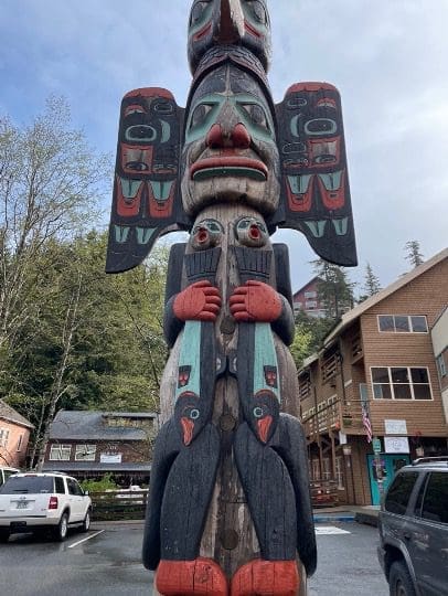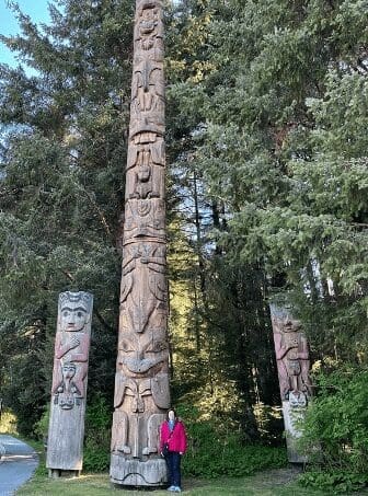 The park was established in 1890 and is the oldest federally designated park in Alaska. It’s home to the authentic Tlingit and Haida Totem Poles that are nestled in a rainforest of giant Sitka spruce trees. The totem poles are unique, colorful and intricate. To give you an idea of the size, I stood next to one of them by the park entrance.