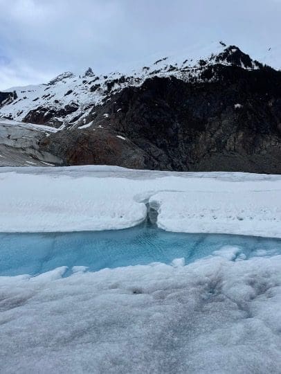 After getting all ‘geared up”, we boarded a helicopter and headed up and over the mountain and on top of the glacier…taking in the views high above Mendenhall Lake! I was surprised by the design of the glacier, layer after layer of flowing ice that created a spectacular jagged but ripple effect.