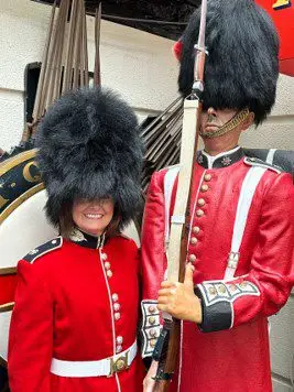 💂 I couldn’t resist the opportunity to “suit up” and try on a “bearskin”, one of the tall ceremonial caps worn by the King’s Guards and other British army foot regiments. It’s quite heavy and was a bit of a balancing act. 💂